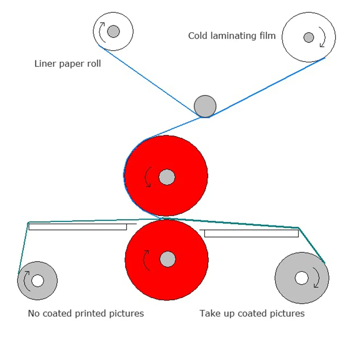 Macchina dotata di rullo superiore a caldo mentre quello inferiore a freddo, permettendo cosଠdi plastificare a caldo da un solo lato o plastificare a caldo nel lato superiore e contemporaneamente applicare il biadesivo nel lato inferiore, in una sola passata.