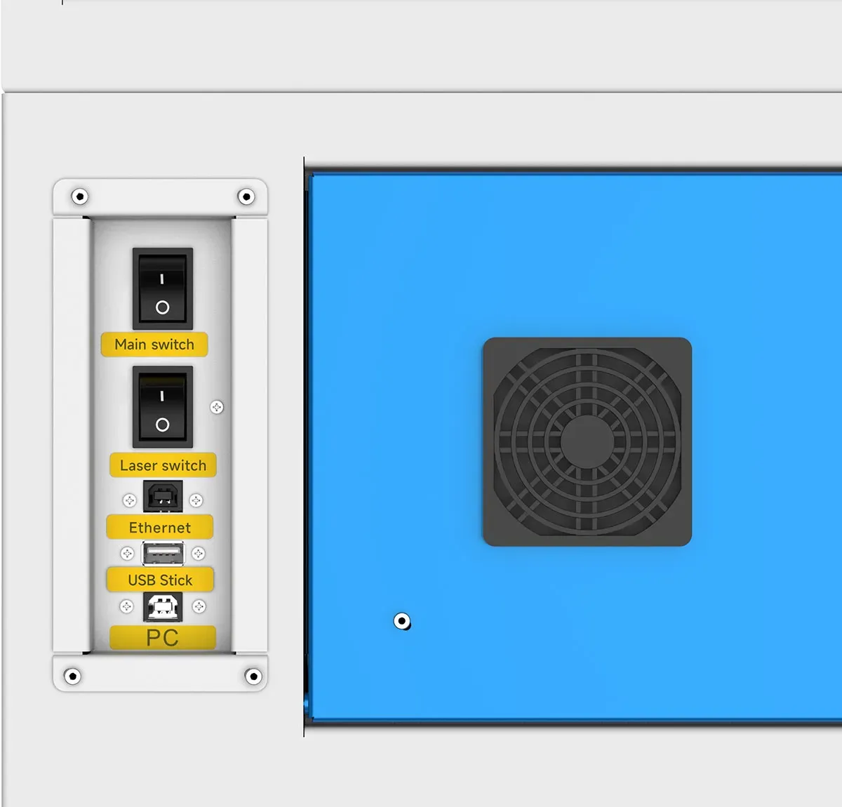 • Sistema di aspirazione intelligente: il sistema di aspirazione entra in funzione solo durante le operazioni, riducendo il consumo energetico. L’aspirazione simultanea superiore e inferiore protegge sia le lenti sia i materiali dai fumi e dalla polvere generati durante la lavorazione laser.