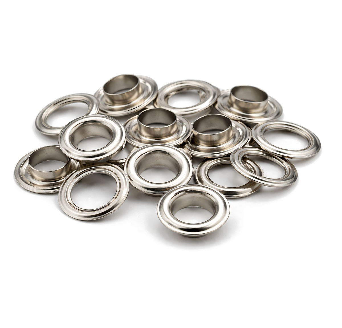Occhielli in metallo maschio/femmina realizzati in lega di ferro-nichel, ideali per applicazioni su banner, teli e materiali pubblicitari.