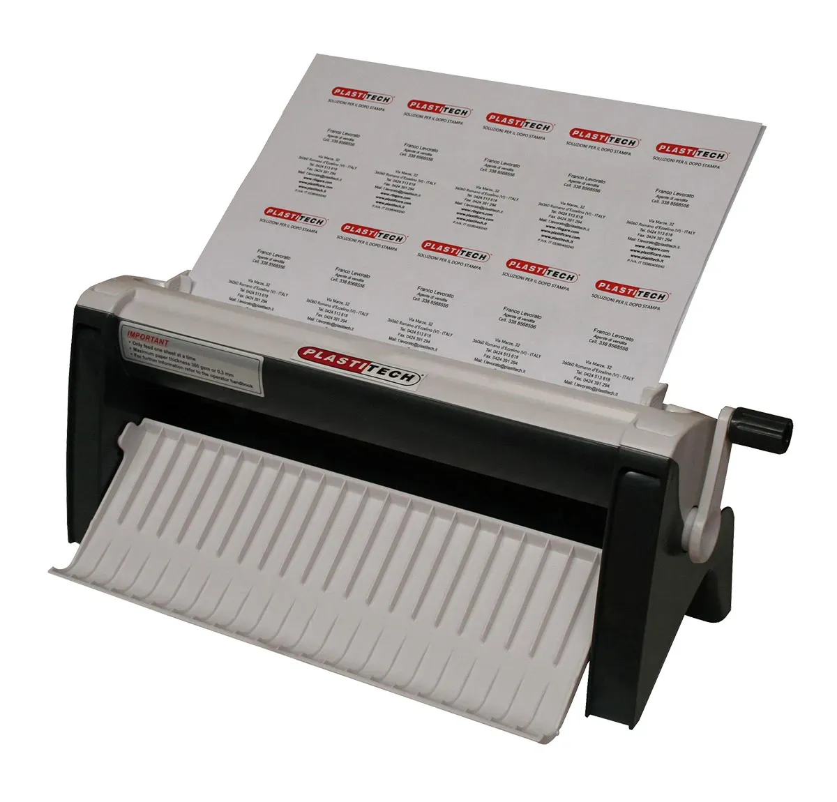 Taglierina manuale per biglietti da visita semplice e funzionale, realizza in due operazioni il taglio completo del biglietto da visita: la prima sarà  di inserire il foglio nel senso verticale ottenendolo cosଠdiviso in due parti; la seconda invece sarà  di inserire le strisce, una dopo l'altra, nel senso orizzontale con il risultato di 5 biglietti per ognuna.