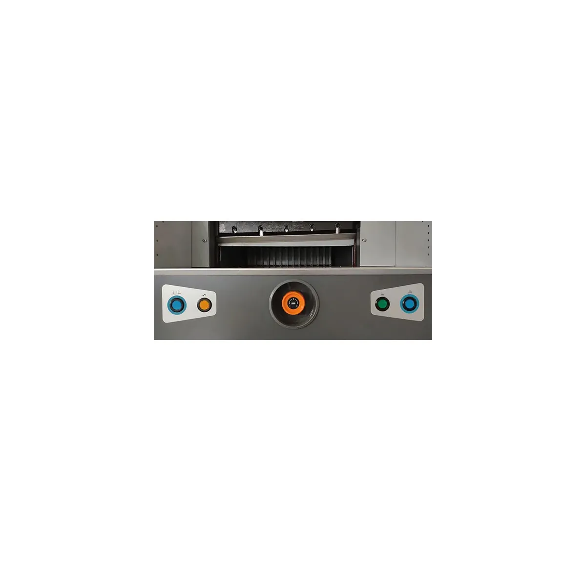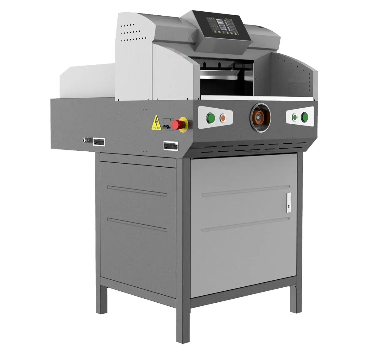 Tagliacarte professionale automatico ad azionamento elettromeccanico della lama e del pressino.