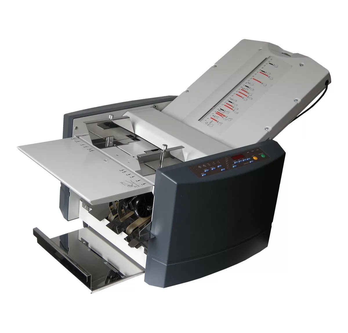 Piegatrice dalle eccellenti prestazioni, dispone di un cassetto a leva di elevata capacità  (500 fogli) con presa carta a 3 rullini.