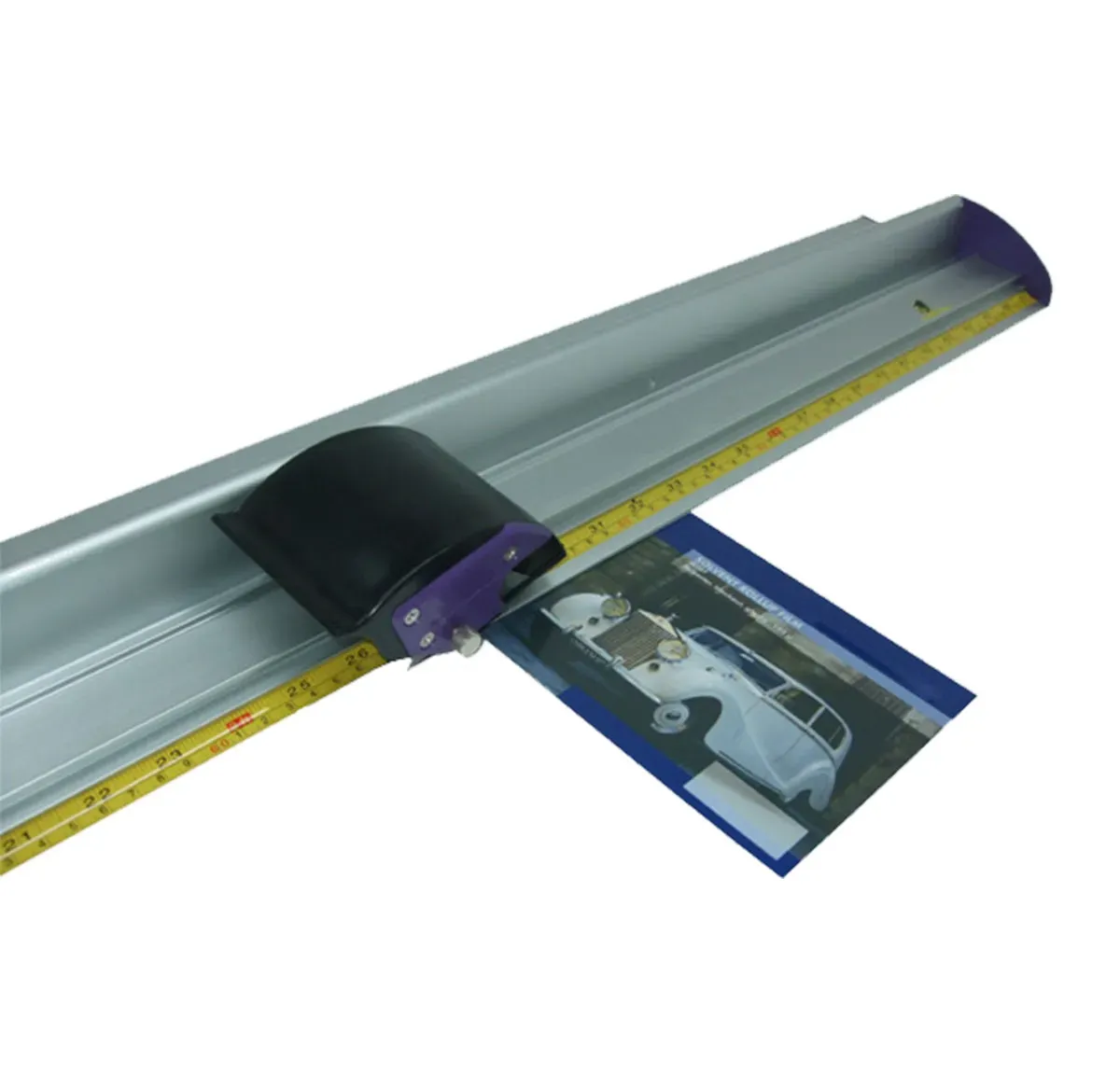 Riga millimetrata per rifilo di stampe, supporti cartacei e pannelli in espanso leggero fino ad un massimo di 5 mm di spessore. La testa di taglio è dotata di lama regolabile in base allo spessore del materiale.