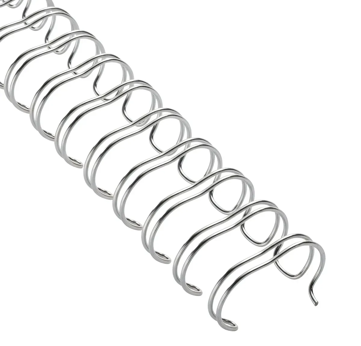 Le spirali metalliche wire a doppia maglia rappresentano una soluzione di rilegatura professionale, elegante e resistente. Fornite tagliate a 30 cm per la rilegatura di documenti in formato A4, come per i dorsi plastici, anche la rilegatura wire richiede la perforazione dei fogli. È fondamentale verificare il numero di fori su 30 cm per evitare errori d’ordine: 34 fori passo 3:1 (fino a 120 fogli rilegabili), 23 fori passo 2:1 (fino a 310 fogli rilegabili). Il dorso viene fornito aperto e deve essere inserito nei fogli perforati, quindi chiuso tramite pressa.