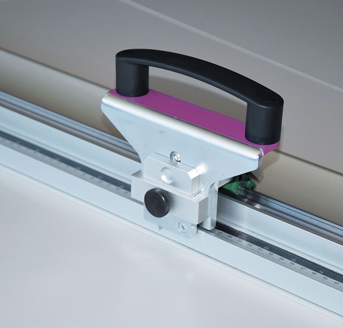 NOVITÀ! Barra di squadra e misura (optional): la barra di squadra con guida millimetrata e battute di misura integrate permette di squadrare perfettamente il materiale e impostare precisamente la misura di taglio desiderata. Questo rende le tagliapannelli INBEST uno strumento di taglio ancora pi๠versatile e preciso. Battuta di misura fino a 90 cm. L'accessorio può essere fissato alla macchina o direttamente al tavolo.