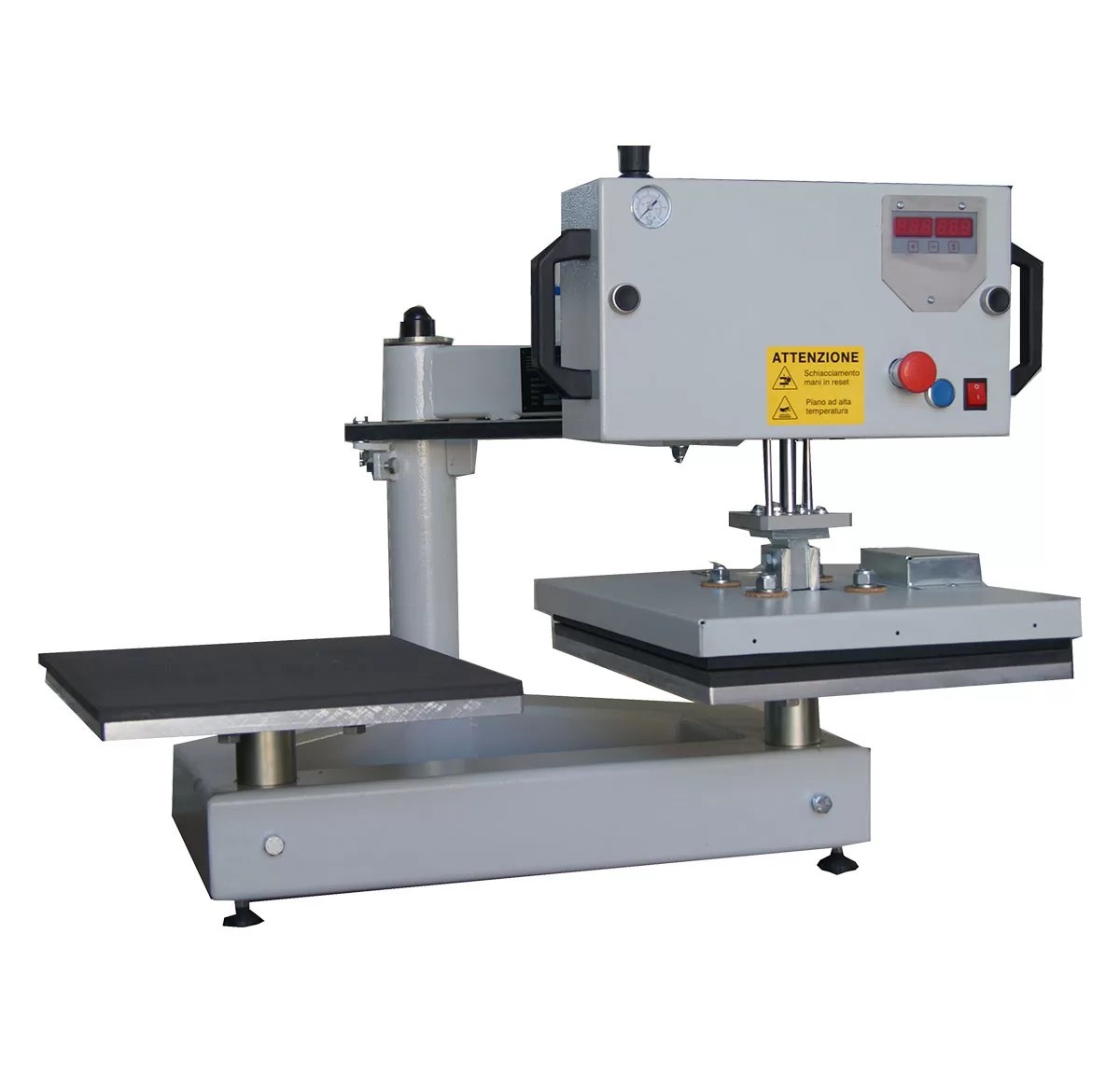 Termopressa pneumatica ad alte prestazioni per il trasferimento termico in vari supporti quali: tessuto, legno, metallo, ceramica, vetro, puzzle, tappetini mouse, etc. Costruita interamente in acciaio, verniciata con polveri epossidiche. Elegante e di estrema maneggevolezza.