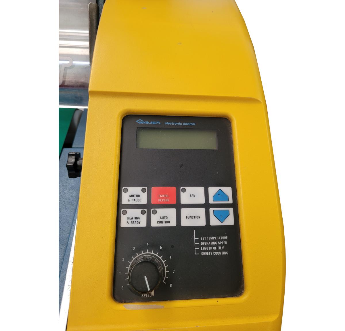 Plastificatrice monofacciale manuale. Temperatura e velocità di plastificazione sono regolabili in funzione del supporto da plastificare e del film utilizzato.